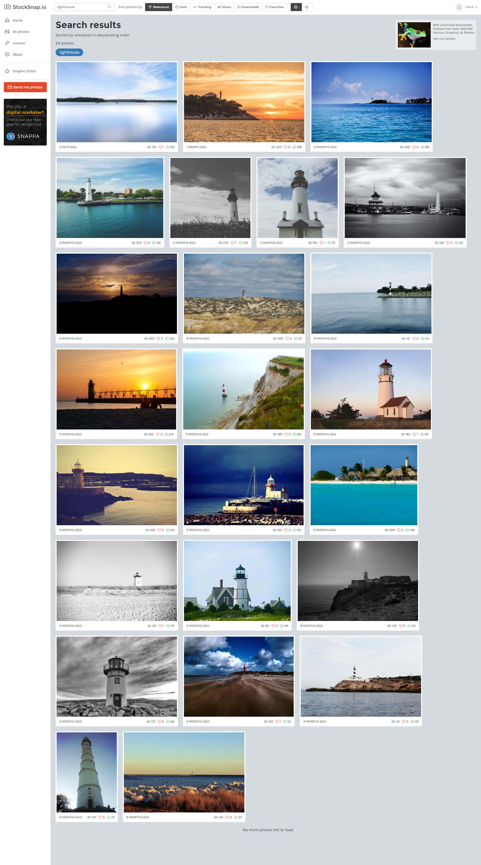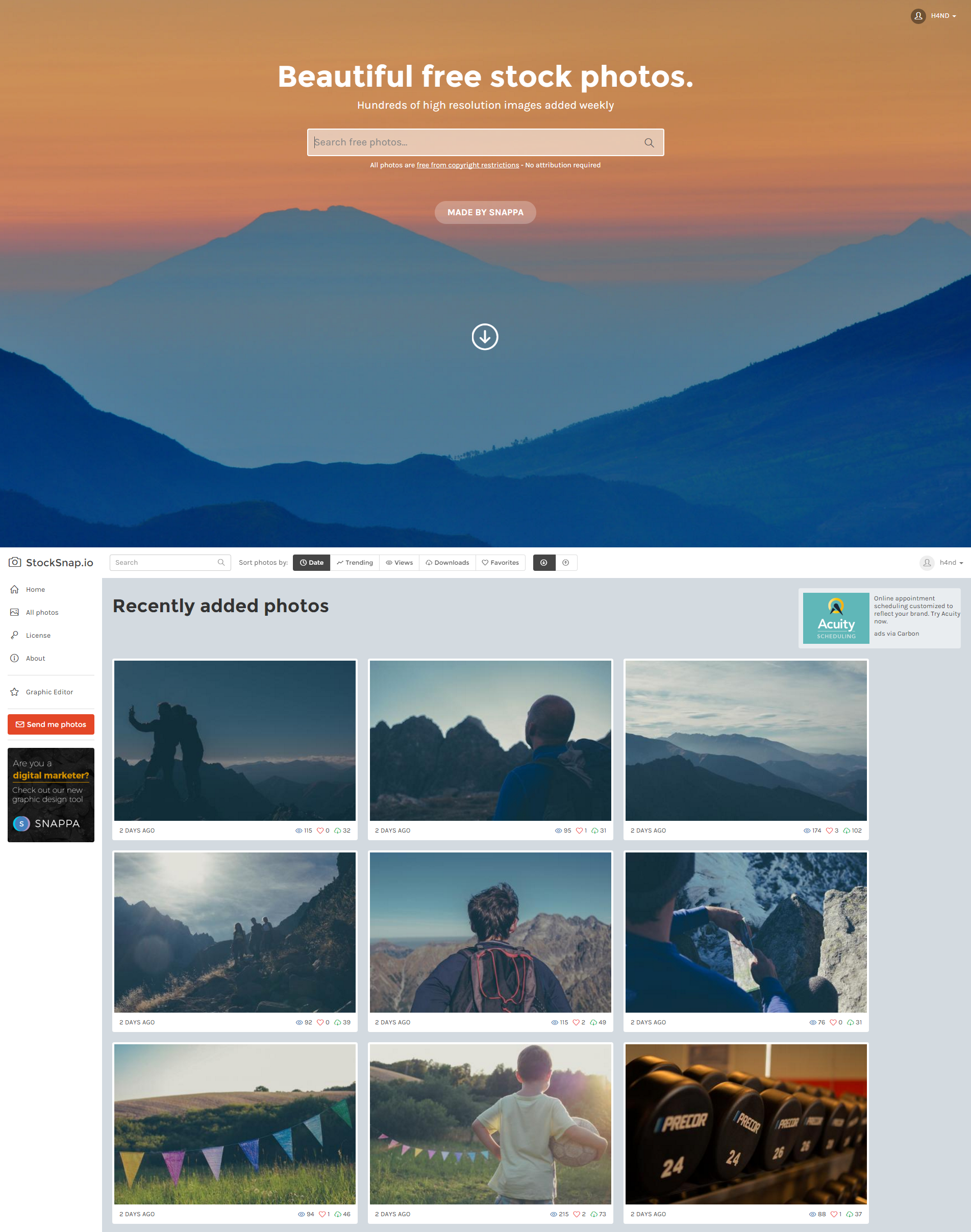 Сервис StockSnap организовали два энтузиаста — Marc Chouinard и Christopher Gimmer. Они вручную отобрали для своего проекта фотографии и уверяют, что их подборка включает в себя только самые лучшие бесплатные работы. Обновление базы изображений (если верить разработчикам) происходит регулярно, сотни фотографий еженедельно пополняют коллекцию StockSnap. Контент, публикуемый на сайте, распространяется под всё той же лицензией Creative Commons Zero (CC0).Тематика изображений довольно однообразна. Тут сложно найти креативные иллюстрации, среди изображений нет коллажей или работ, сделанных с помощью графического редактора, а отрендеренных 3D-картинок нет вообще. Все изображения — исключительно фотографии, как есть. Зато StockSnap радует разнообразием предметной съемки, а также предлагает массу действительно красивых снимков природы. Это отличное место, чтобы найти картинки для оформления, скажем, сайта турфирмы, кулинарного веб-ресурса, портала, посвященного животным.
