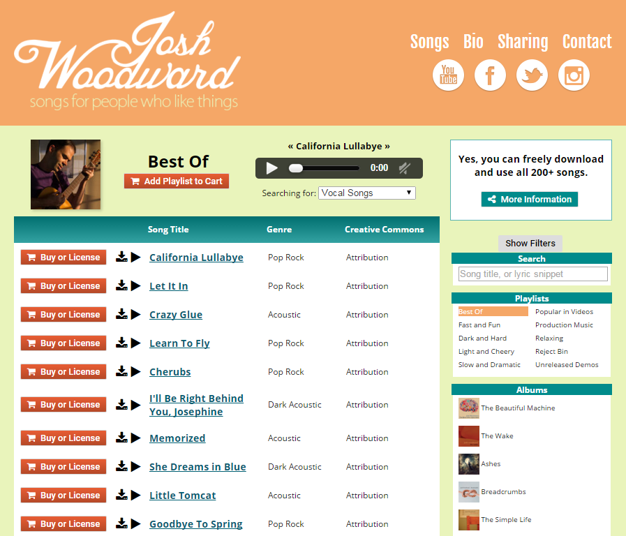 Времена, когда для раскрутки музыканта нужно было иметь связи на радио и телевидении, уходят в прошлое. Сегодня через Интернет любой талантливый исполнитель может заявить о себе. Интернет-аудитория — самый объективный судья. Если представленный материал хорош, то и популярность такого исполнителя не за горами. Помните ажиотаж вокруг кавер-версии Somebody That I Used to Know в исполнении молодой группы Walk off the Earth? Этот клип только на официальном канале группы посмотрели 168 миллионов раз! А сама группа с момента публикации своего первого хита получила мощный стимул творить дальше, что она с успехом и делает. Подобных примеров внезапной популярности можно привести очень много.Джош Вудворд также относится к новому поколению музыкантов, которые зарабатывают своим талантом, а не с помощью черного пиара. На официальном сайте Джош опубликовал сотни своих песен. “Вы можете их загружать абсолютно бесплатно, не боясь, что вам предъявят иск” — пишет музыкант в своём блоге. Единственное, что он просит взамен — рассказать как можно большему количеству друзей о понравившейся песне, послать по электронной почте, сделать публикацию в социальной сети. Не так-то и много за удовольствие от музыки. И мы не видим причин, почему бы этого не сделать.