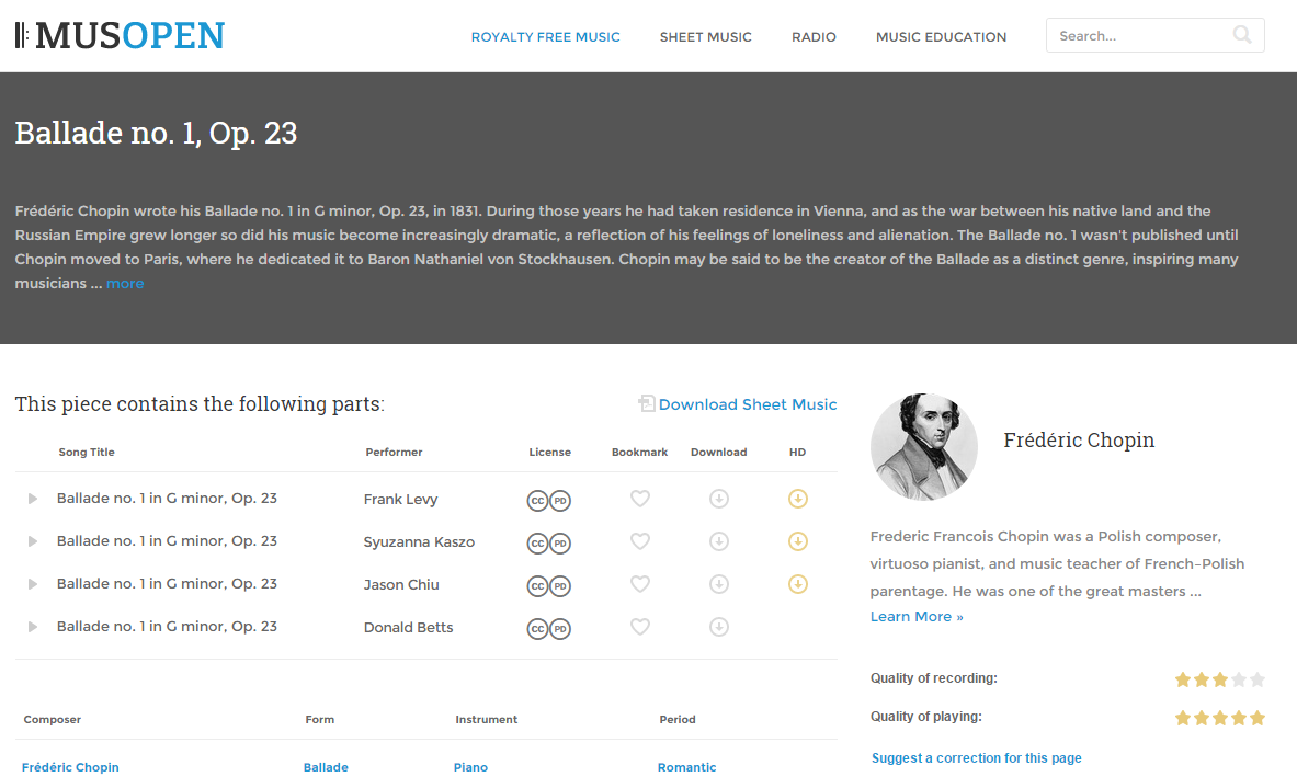 Что до собранной фонотеки, то она вся тщательно отсортирована по композиторам и жанрам. Можно искать мелодию по типу инструмента или по имени автора, уточняя период времени или выбирая точное название произведения. Библиотека ресурса использует систему рейтингов, которая определяет качество записи аудиоматериала. Дело в том, что, помимо “выкупленных” музыкальных композиций, в фонотеке Musopen много концертных и любительских записей, также есть оцифрованный винил. Поэтому качество многих треков далеко от идеального.
