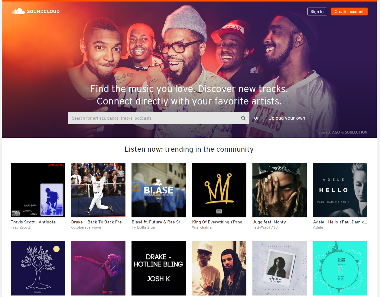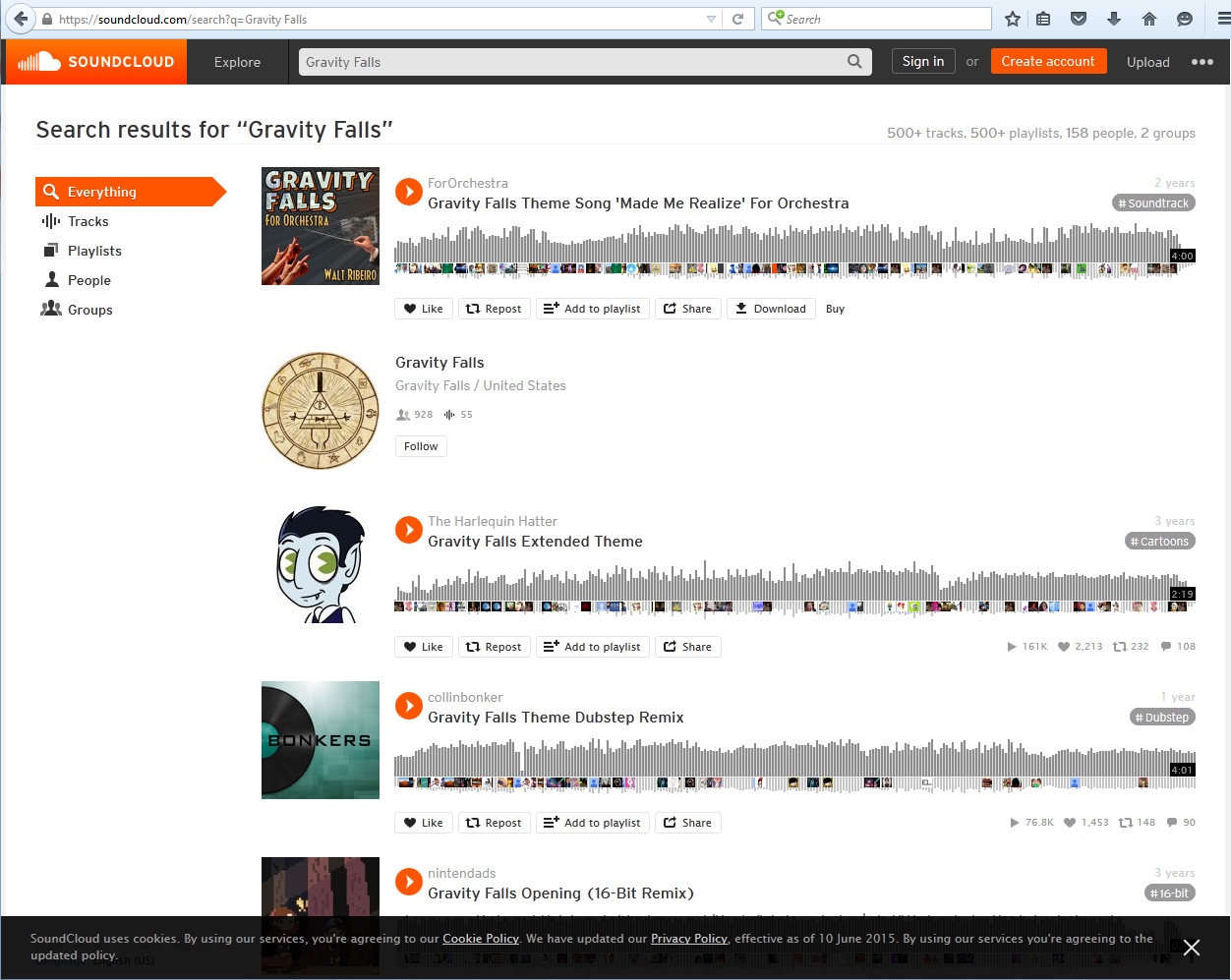Платформу Soundcloud можно считать прямым конкурентом Jamendo. Этот сервис также является связующим звеном между музыкантами и их слушателями, стремясь к созданию как можно большего сообщества.По сравнению с Jamendo, интерфейс Soundcloud более дружелюбен, поиск удобнее. Даже сам проигрыватель имеет более привлекательный вид — прямо в его окне отображается волновая форма сигнала, к которой можно прикреплять комментарии в том или ином месте трека. А чтобы оценить объем аудиоматериала, который хранится на серверах Soundcloud, достаточно взглянуть на список ремиксов и кавер-версий какой-нибудь популярной мелодии, например к Made me realize от Brad Breeck, которая используется как заглавная тема сериала Gravity Falls. Число вариаций на эту тему столь велико, что, кажется, фантазия музыкантов не имеет границ.