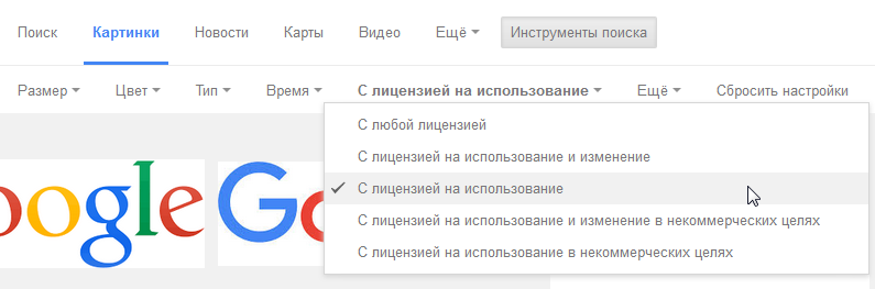 Так где же искать бесплатный легальный мультимедийный контент? Начнем с поиска изображений.⇡#"Картинки Google" — фильтр по типу лицензии